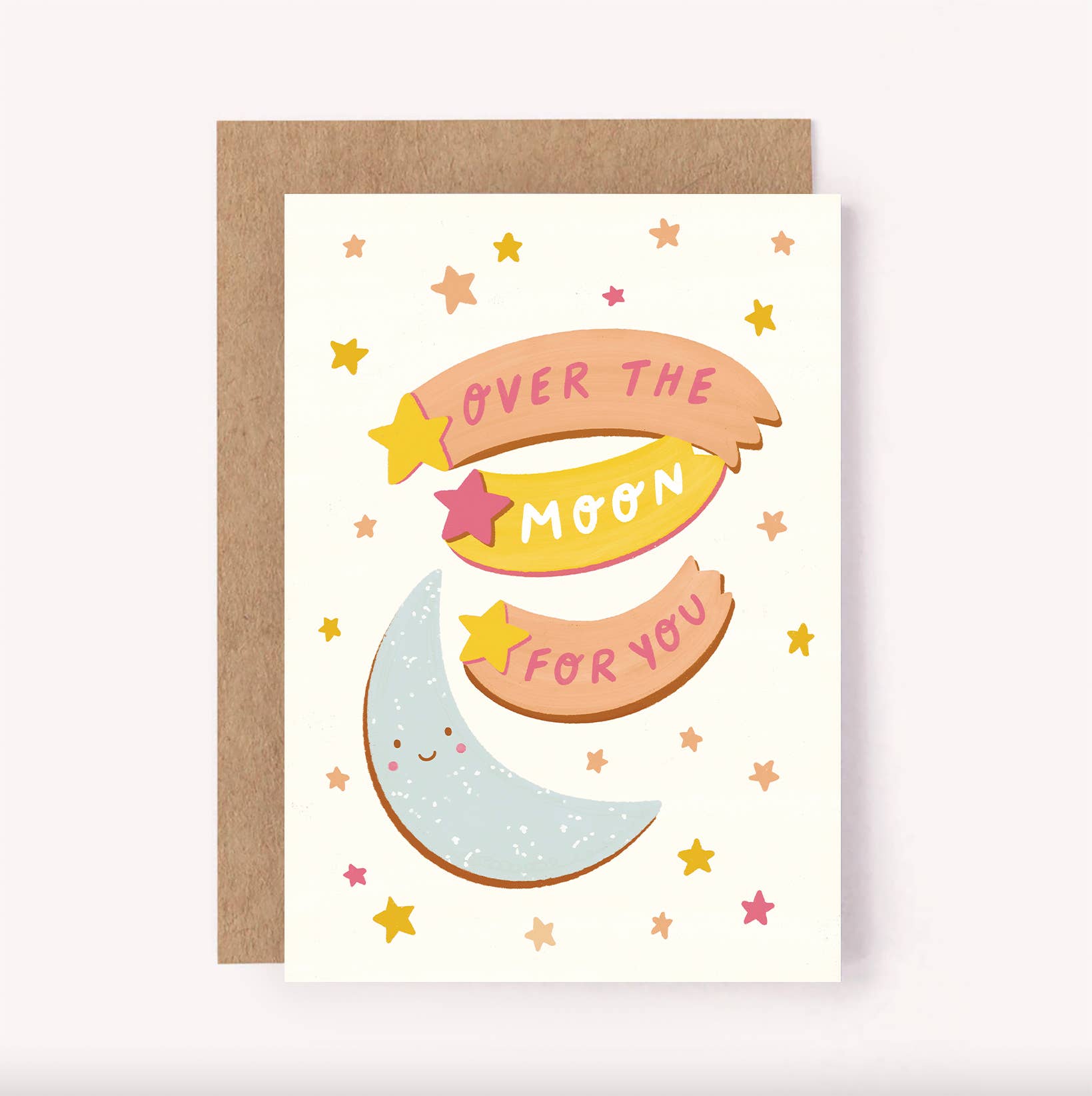Celebrate life’s happy moments with this sweet, illustrated greeting card. Featuring an enchanting moon surrounded by shooting stars and the handwritten message “Over the Moon for You” in soft pink and yellow tones, it’s a thoughtful way to mark exciting milestones big and small.