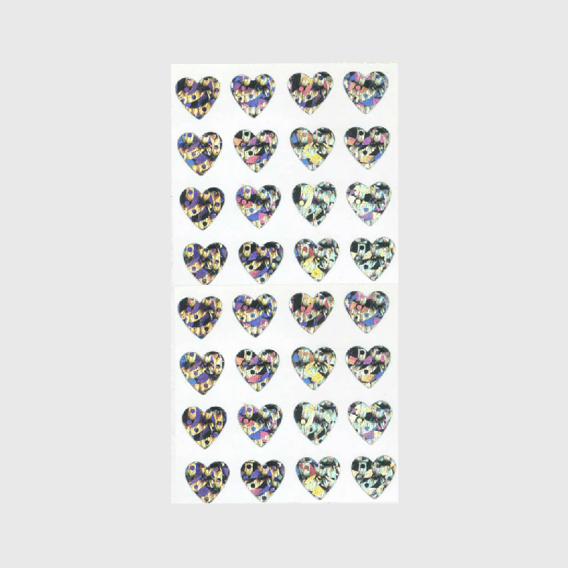 Sparkly prismatic stickers featuring silver hearts.