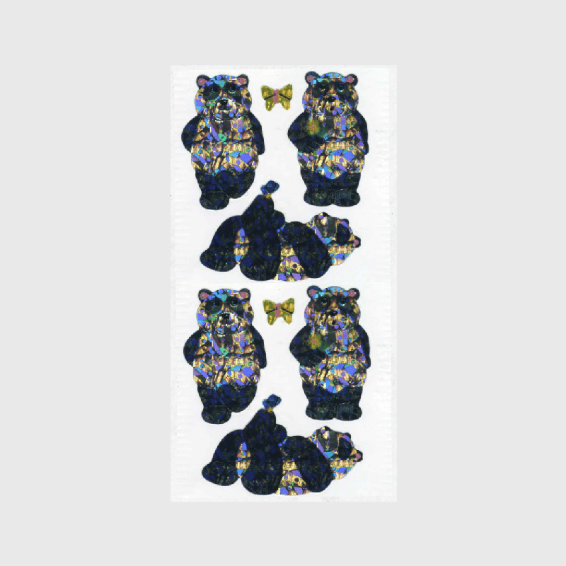 Sparkly prismatic stickers featuring snuggly panda bears.